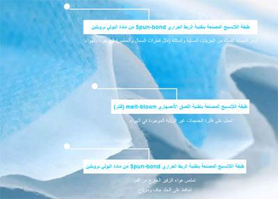 - تركيبة النسيج: الطبقة الخارجية + الطبقة الوسطى مكونة من النسيج غير المنسوج ، طبقة النسيج مصنعة بتقنية اللصق الأنصهاري melt-blown